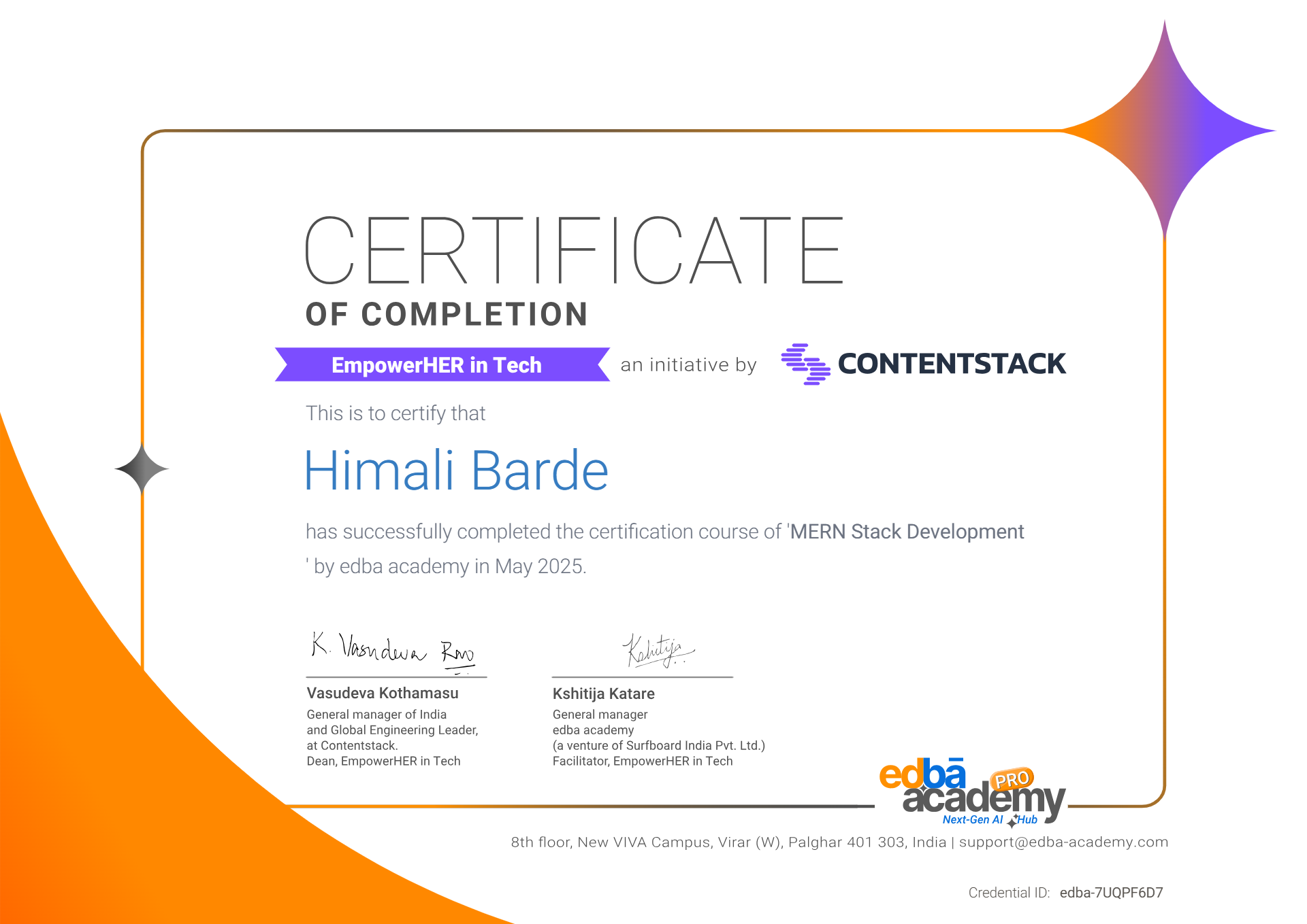 GITHUBSuccessfully completed the MERN Stack Development Certification under the EmpowerHER in Tech initiative. Gained hands-on experience with HTML, CSS, JavaScript, React.js, Node.js, Express.js, MongoDB, and Git & GitHub — building real-world projects that strengthened both technical skills and developer confidence.